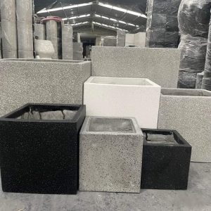 Chậu trồng cây hình vuông này được sản xuất với những chất liệu như xi măng + đá mài+ cát+ lưới fiber+ phụ gia