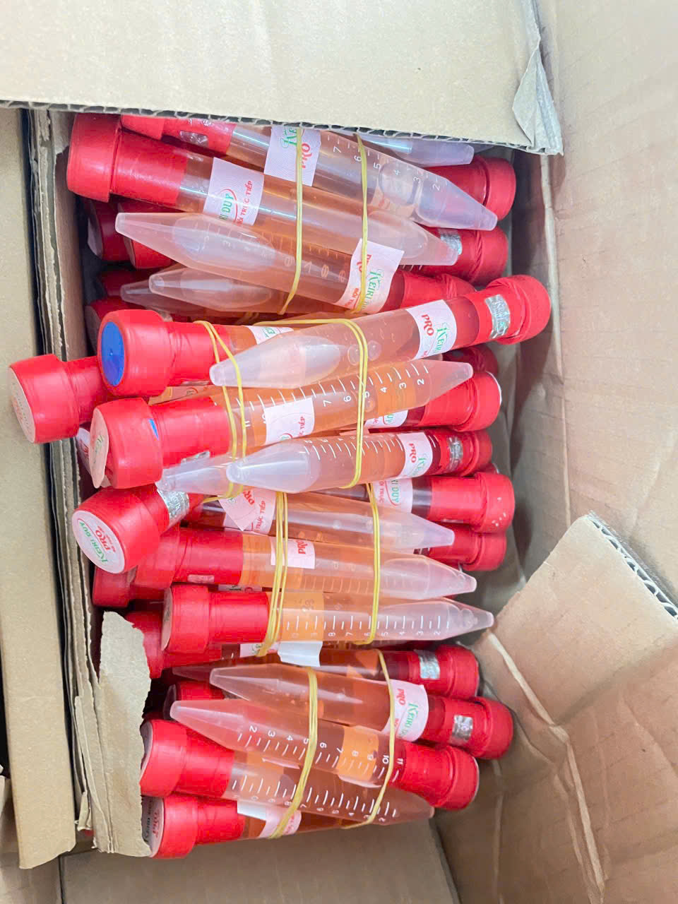 Bao bì: Ống nhựa chia vạch định lượng, nắp đỏ kín, tem dán rõ ràng